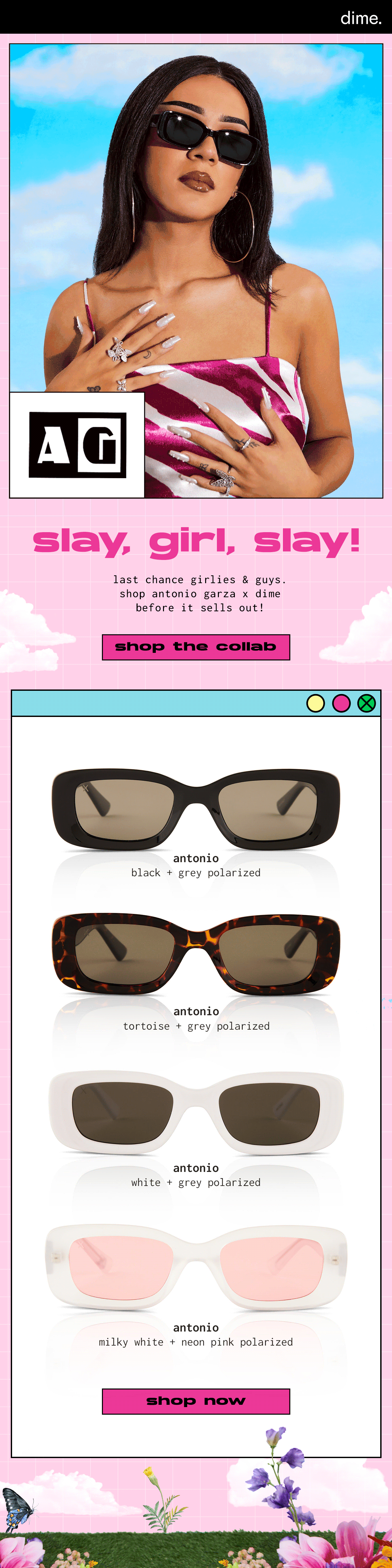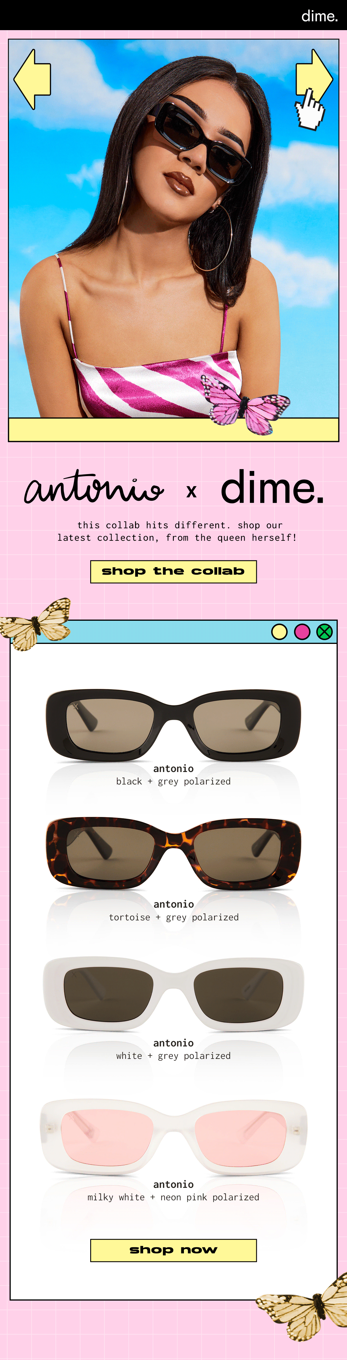 Branding + Social Media + Web + Email Assets The beauty and lifestyle social media icon brought her influencer eye to dime to craft a line of on-trend, fresh frames from a Gen Z style perspective. Part of dime’s franchise collaborations. Slide 1 Slide 1 (current slide) Slide 2 Slide 2 (current slide) Campaign Emails IG Teasers Slide 1 Slide 1 (current slide) Slide 2 Slide 2 (current slide) Slide 3 Slide 3 (current slide) Slide 4 Slide 4 (current slide) Slide 5 Slide 5 (current slide) Slide 6 Slide 6 (current slide) TikTok Ads