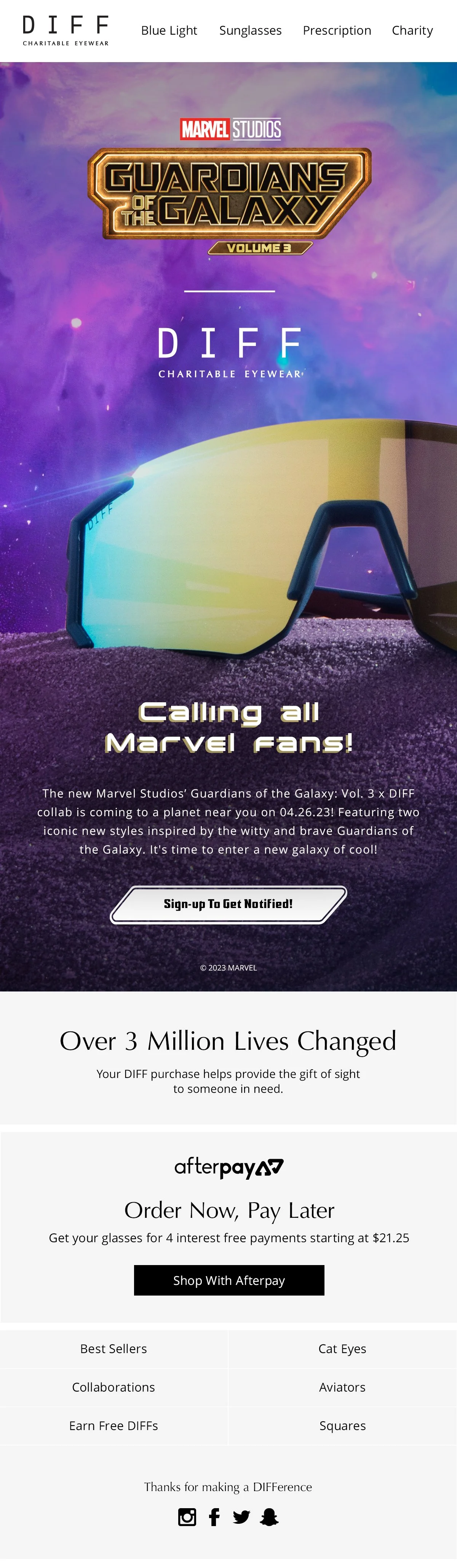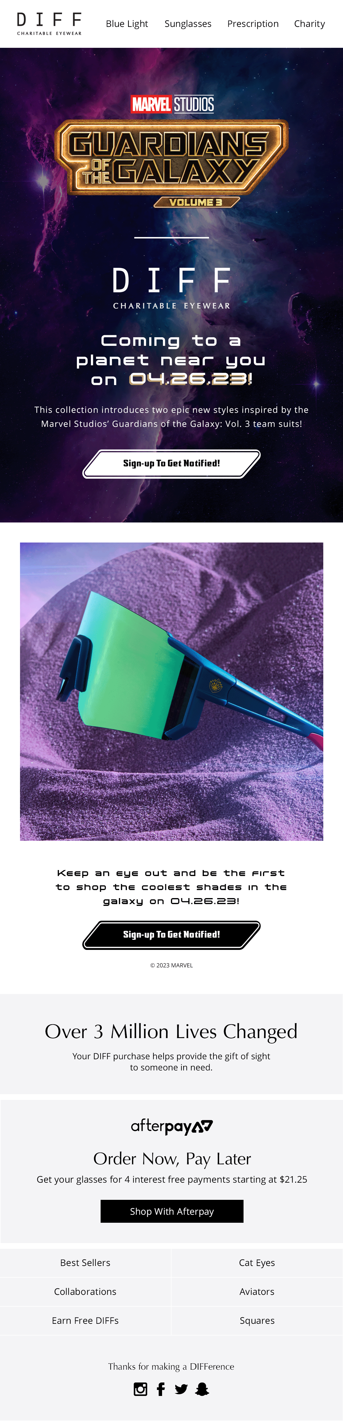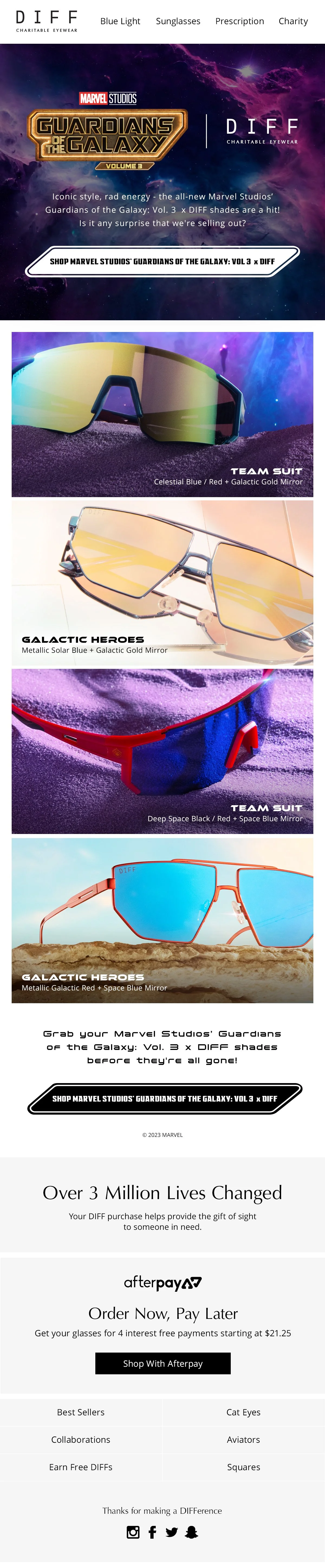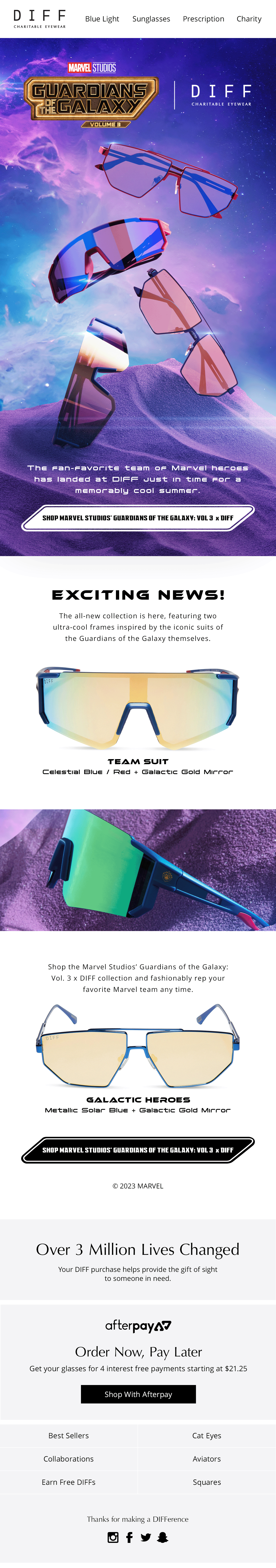 Introducing the new Marvel Studios' Guardians of the Galaxy: Vol 3™ x DIFF collection. This project introduces two stellar new styles inspired by the Marvel Studios' Guardians of the Galaxy™ team suits!