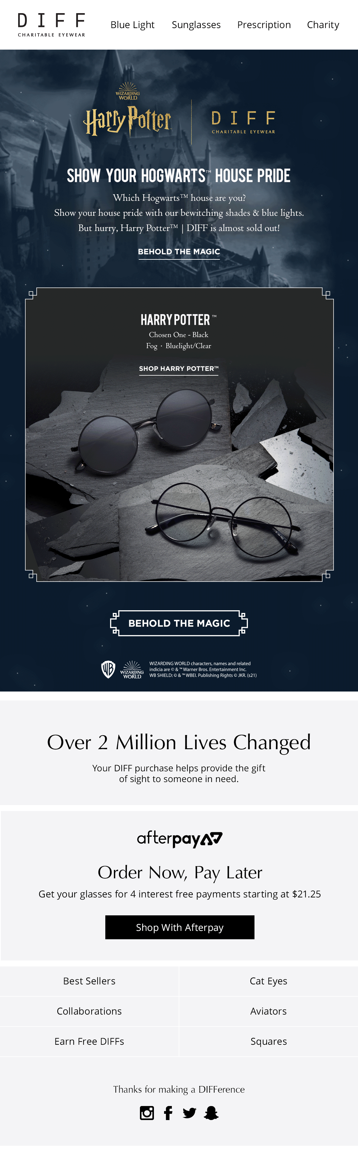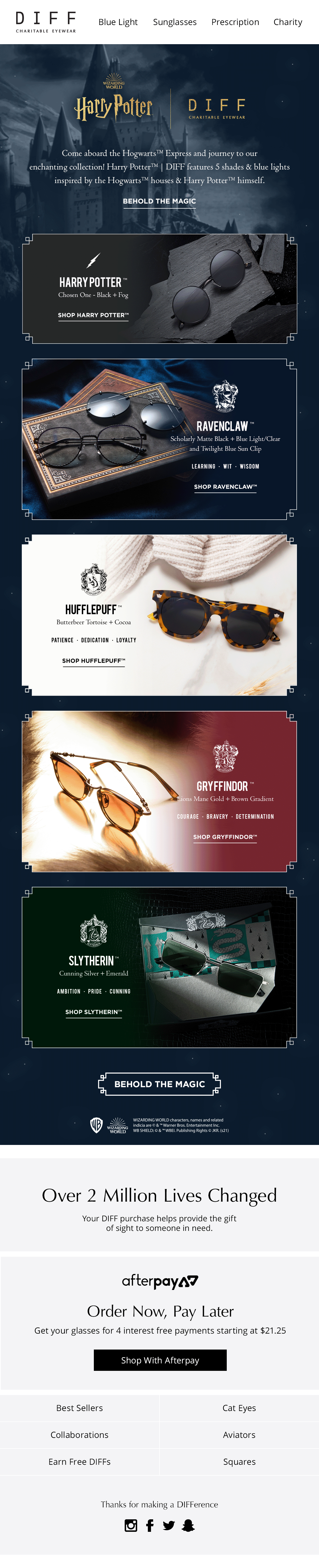 An enchanting collection featuring 5 magical shades and blue lights inspired by the beloved characters and lore of the Harry Potter™ series. These sunnies represent timeless styles featuring Hogwarts™ houses and Harry Potter™ himself. Part of DIFF’s franchise collaborations.