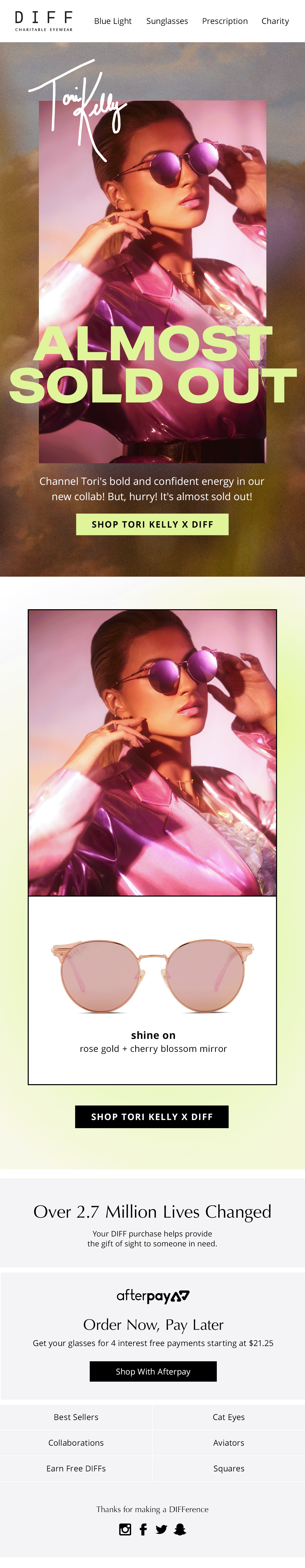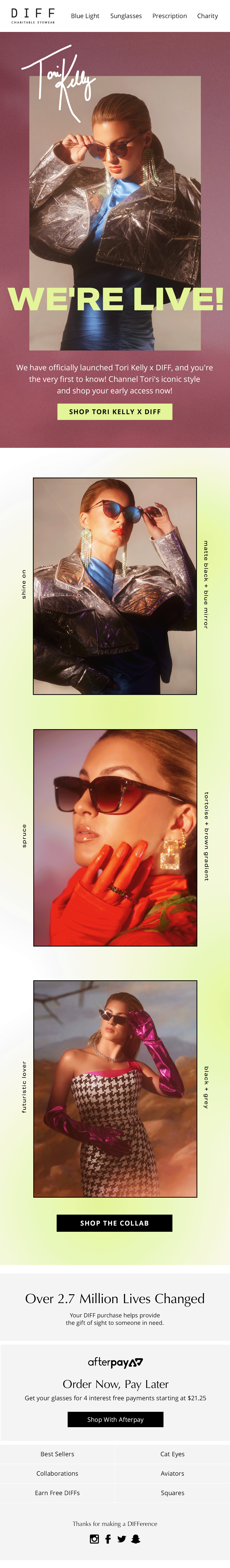 Sunnies that belong in the spotlight! Designed in conjunction with singer and social media icon Tori Kelly, this collection truly sings, with shades ranging from futuristic to red-carpet-worthy. Part of DIFF’s influencer collaborations.
